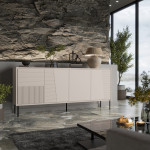 Abi to nowoczesna komoda w kolorze kaszmir, która zwróci uwagę wszystkich. Doskonale wpasuje się w nowoczesnych aranżacjach. Prosta forma wzbogacona została modnym frezowanym frontem, który nadaje całości wyjątkowego charakteru. Zaletą mebla są wysokie nóżki, wykonane ze stali malowanej proszkowo dzięki nim bryła zyskuje wizualną lekkość i stabilność. Dodatkowo takie rozwiązanie ułatwi utrzymanie czystości pod meblem. Komoda została podzielona na pojemne wnęki z półkami, zatem bez problemu pomieścisz w nich niezbędne rzeczy. Komoda dostępna również w kolorze białym i czarnym.Do komody można domówić szafki RTV również w trzech kolorach.