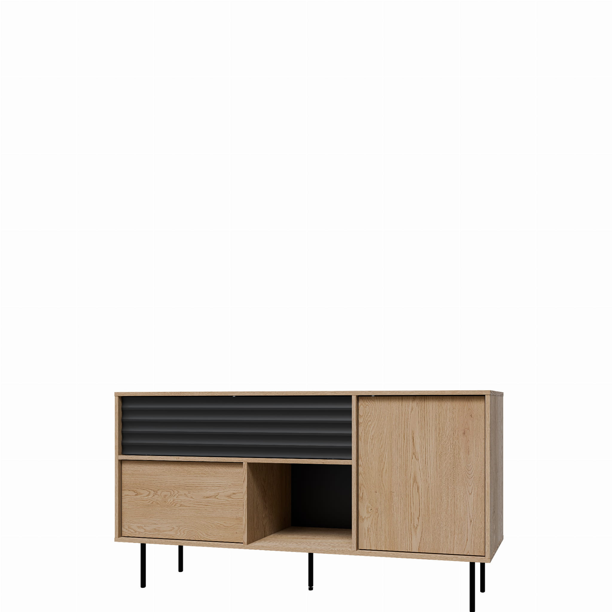 Komoda ARD-150 składa się z części frontowej zamykanej i otwartej (1drzwi, 1 klapa, 1 szuflada) Korpus mebla wykonany z matowej płyty laminowanej, front z płyty jak korpus i z płyty mdf oklejonej folią PVC , na nóżkach czarnych ((wys. nóżek 20 cm). We frontach czarny mat wykonano wyraźne frezowanie nadające głębi oraz elegancji dla całego mebla. Drzwi posiadają zawiasy z cichym domykiem.
