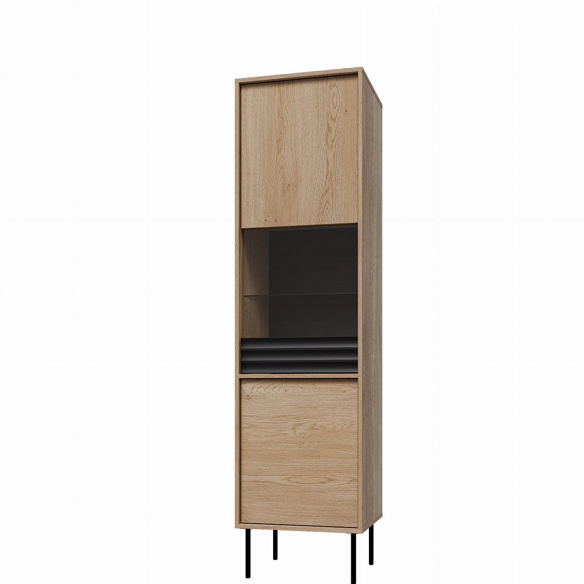 Witryna ARD-WI50 wewnątrz której znajdują się: półka szklana z bezpiecznego hartowanego szkła oraz 3 półki z płyty. Do mebla istnieje możliwość dokupienia oświetlenia NEO-17 ciepłe białe . Korpus mebla wykonany z matowej płyty laminowanej, front z płyty jak korpus i z płyty mdf oklejonej folią PVC , na nóżkach czarnych ((wys. nóżek 20 cm). We frontach czarny mat wykonano wyraźne frezowanie nadające głębi oraz elegancji dla całego mebla. Drzwi posiadają zawiasy z cichym domykiem.