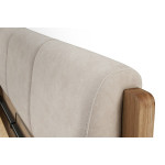 Łóżko sypialniane z pojemnikiem i tapicerowanym wezgłowiem, pod materac 200 x 200. Łóżko posiada w starndardzie stelaż na metalowej ramie z gazowymi podnośnikami. Stelaż łóżka posiada standardowo 34 listwy sprężynujące. Wezgłowie łóżka tapicerowane opcjonalnie.