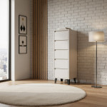 Ta komoda z pięcioma szufladami zachwyca prostotą i elegancją, a jednocześnie zapewnia mnóstwo miejsca do przechowywania. Czarne, wysokie nóżki dostosowane do robota sprzątającego, nie tylko podkreślają wygląd bryły, ale także dodają jej charakteru.