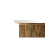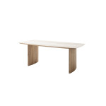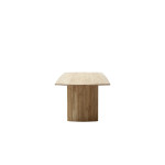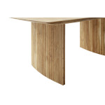 Oparcie stołu stanowią dwie masywne kolumny z frezowanymi listewkami, również wykonane z lakierowanego drewna akacjowego. Ich półokrągły kształt oraz precyzyjne wykończenie dodają całości nowoczesnego, a zarazem naturalnego charakteru.