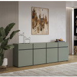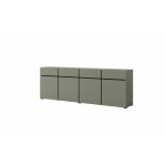 Ta elegancka komoda w odcieniu zieleni z czarnymi wstawkami to doskonałe połączenie nowoczesnego minimalizmu i praktyczności. Jej gładkie fronty bez uchwytów podkreślają estetyczny, surowy charakter, a system otwierania „push-to-open” zapewnia wygodę użytkowania.