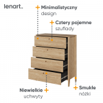Mała komoda do sypialni z kolekcji COZY to funkcjonalność i styl w jednym. Poszukujesz mebla, który pomieści drobiazgi, a jednocześnie nada wnętrzu wyjątkowego uroku? CZ-03 to odpowiedź na Twoje potrzeby. To praktyczne rozwiązanie zaprojektowane z myślą zwłaszcza o niewielkich pomieszczeniach. Jej kompaktowe wymiary pozwalają na umieszczenie jej nawet w niedużych wnętrzach, a cztery pojemne szuflady zapewniają mnóstwo miejsca na przechowywanie. Na górze znajduje się blat, na którym można postawić lampkę nocną, zdjęcia czy inne dekoracje. Teraz już zawsze będziesz mieć wszystkie niezbędne przedmioty zawsze pod ręką.