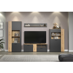 Witryna niska ESTEBAN 2D1W grafit / dąb evok to połączenie nowoczesnej elegancji i funkcjonalności, które doskonale uzupełni wystrój salonu, jadalni lub pokoju dziennego. Kontrast głębokiego grafitu z ciepłym odcieniem dębu evok tworzy harmonijną kompozycję, nadając wnętrzu przytulny, a zarazem stylowy charakter.