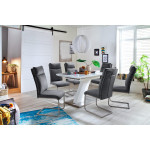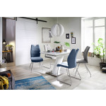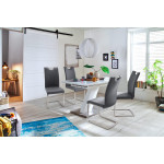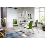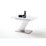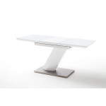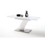 Stół biały lakierowany wysoki połysk. Szkło wkładka lakierowana biały wysoki połysk. Podstawa stalowa szlachetna szczotkowana. Prowadnice synchroniczne.
