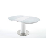 Stół blat okrągły lakierownay biały mat. Szkło białe matowe. Wkładka lakierowana biały mat. Podstawa stalowa szlachetna szczotkowana. Prowadnica synchroniczna