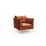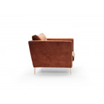 Nowoczesna z odrobiną klasyki, lekka sofa, na pięknych metalowych nogach w kolorze miedzi. Farina jest starannie wykończona, dlatego może stać na środku pomieszczenia. Poduchy oparcia mają dekoracyjne przeszycie, które nadaje sofie elegancji.