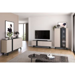 Wyrafinowany kaszmirowy kolor frontów i boków dopełniliśmy klasycznie czarną wstawką, blatem i podstawą. Stylowe nóżki dodają meblom lekkości i wyjątkowego charakteru, a bezuchwytowe fronty dodatkowo podkreślają współczesny design. Starannie wyselekcjonowane typy brył pozwolą zaaranżować wiele wnętrz, niezależnie od ich metrażu.