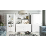 Styl mebli podkreślają zaokrąglone fronty w białym połysku wykonane z płyty MDF oraz lustrzany cokół, który przyjmuje kolorystykę otoczenia. Luksusowy charakter mebli tworzy również oświetlenie LED - dodające wnętrzu oryginalnego klimatu - oraz wygodne zawiasy z cichym domykaniem. Całości dopełnia zestaw chromowanych uchwytów z imitacją diamentu - rozpraszają one światło tworząc magiczny efekt.
