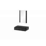 Toaletka Isla w kolorze czarnym to elegancki i funkcjonalny mebel podwieszany. Wyposażona w praktyczną szufladę z ozdobnym, ryflowanym frontem, zapewnia miejsce na kosmetyki i drobiazgi. W zestawie znajduje się prostokątne lustro, którego boczne krawędzie zdobią stylowe ryfle, podkreślające nowoczesny charakter całości. Idealna propozycja do sypialni lub garderoby, łącząca estetykę z wygodą użytkowania