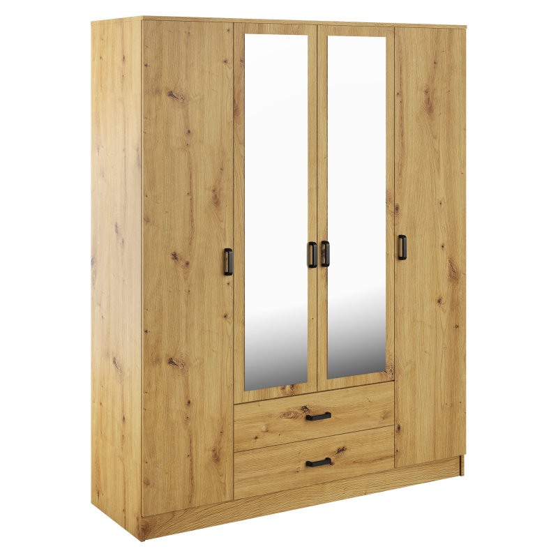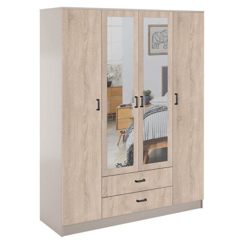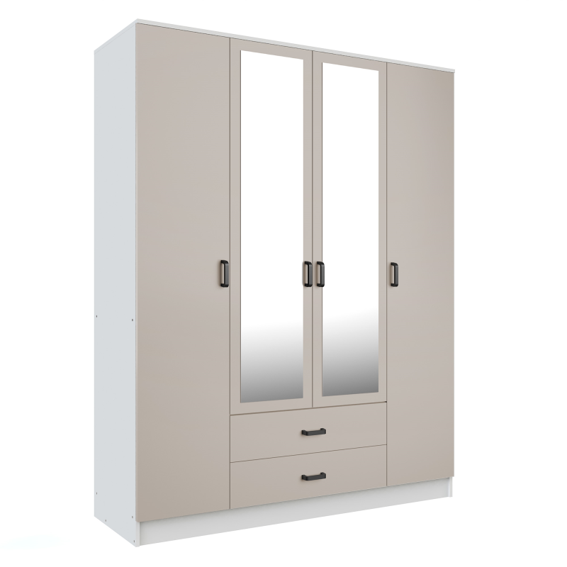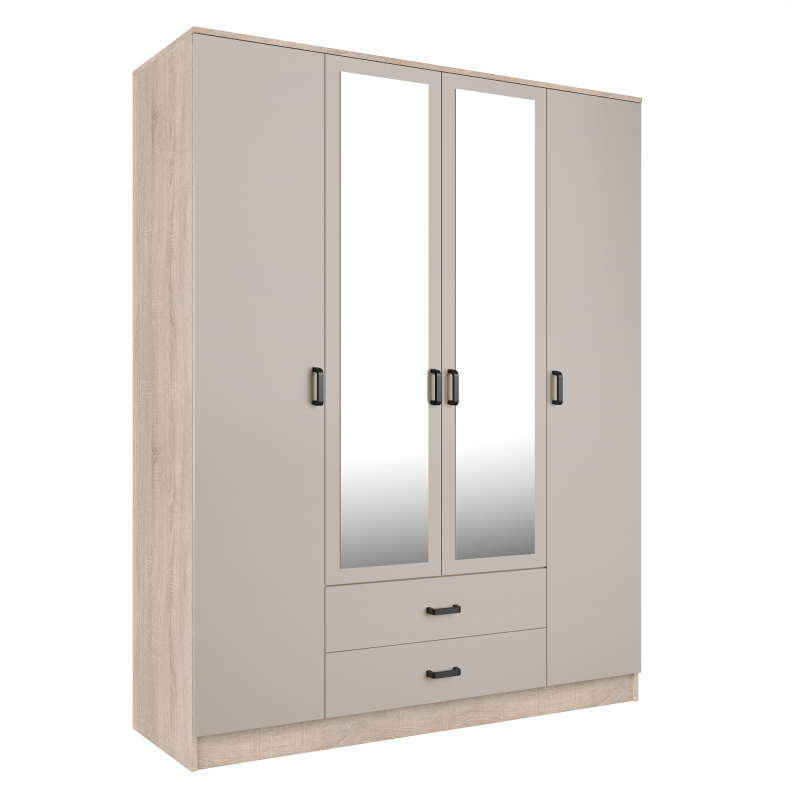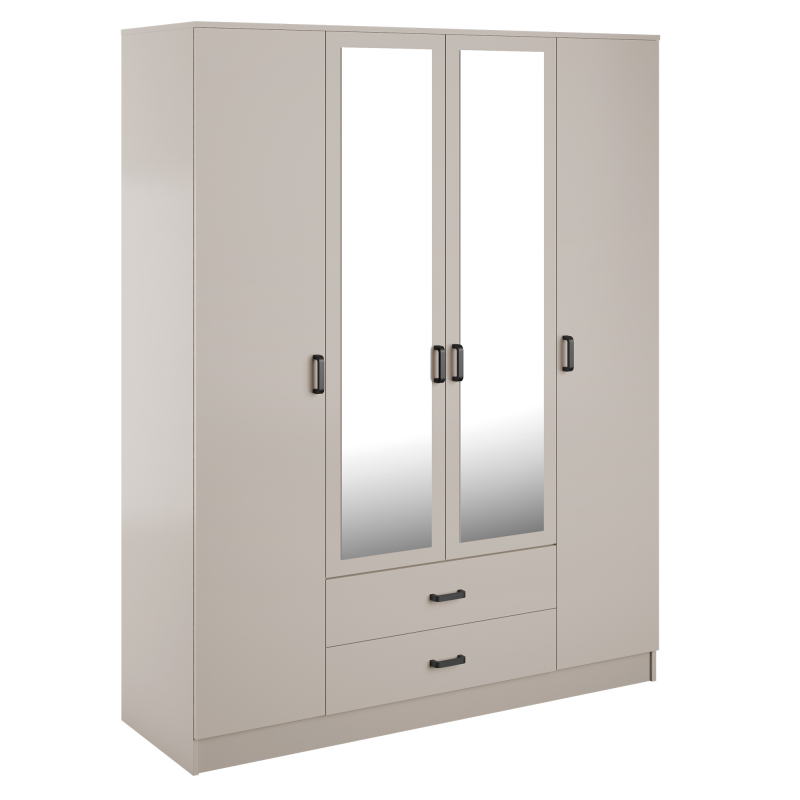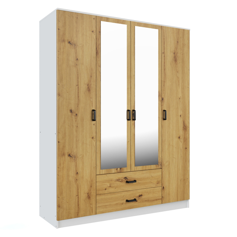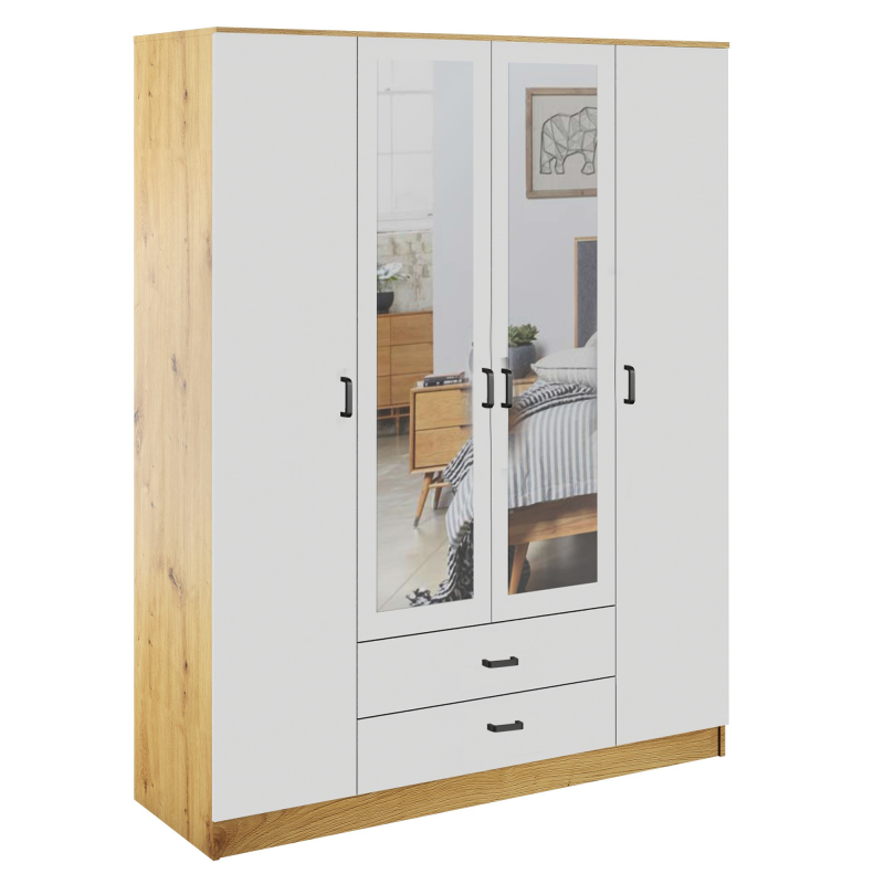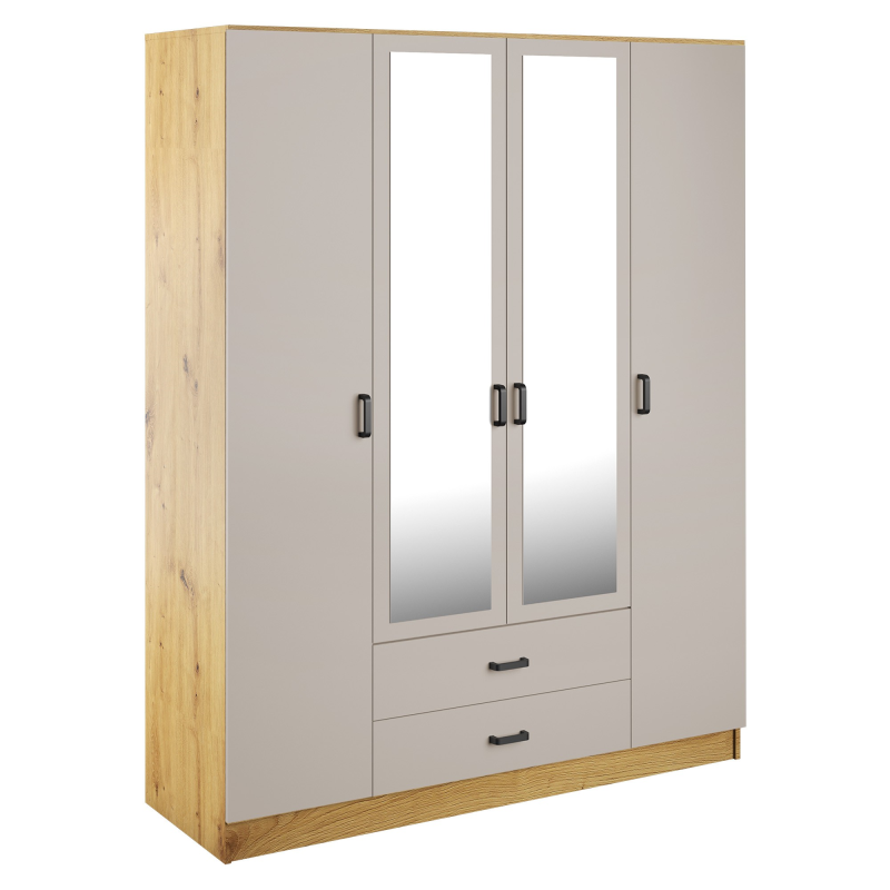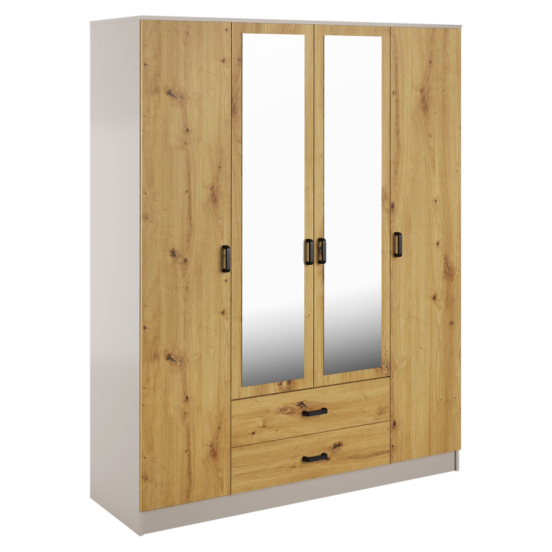 Praktyczna i elegancka szafa o wymiarach: szerokość 160 cm, wysokość 205,6 cm, głębokość 53,8 cm. Model wyposażony jest w cztery drzwi, z czego środkowe posiadają lustro, które nie tylko optycznie powiększa przestrzeń, ale też jest bardzo funkcjonalne na co dzień.