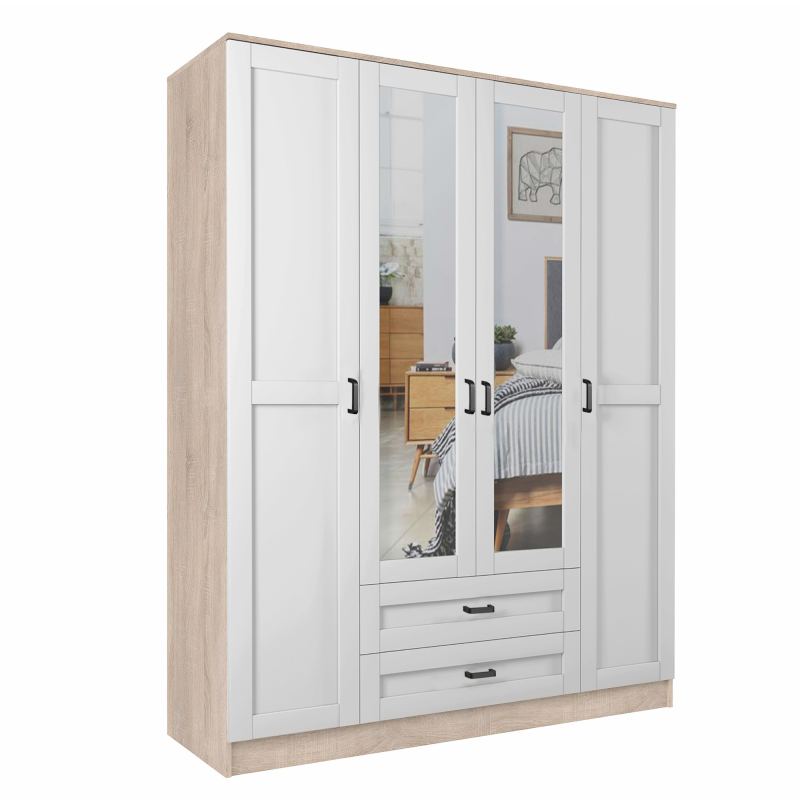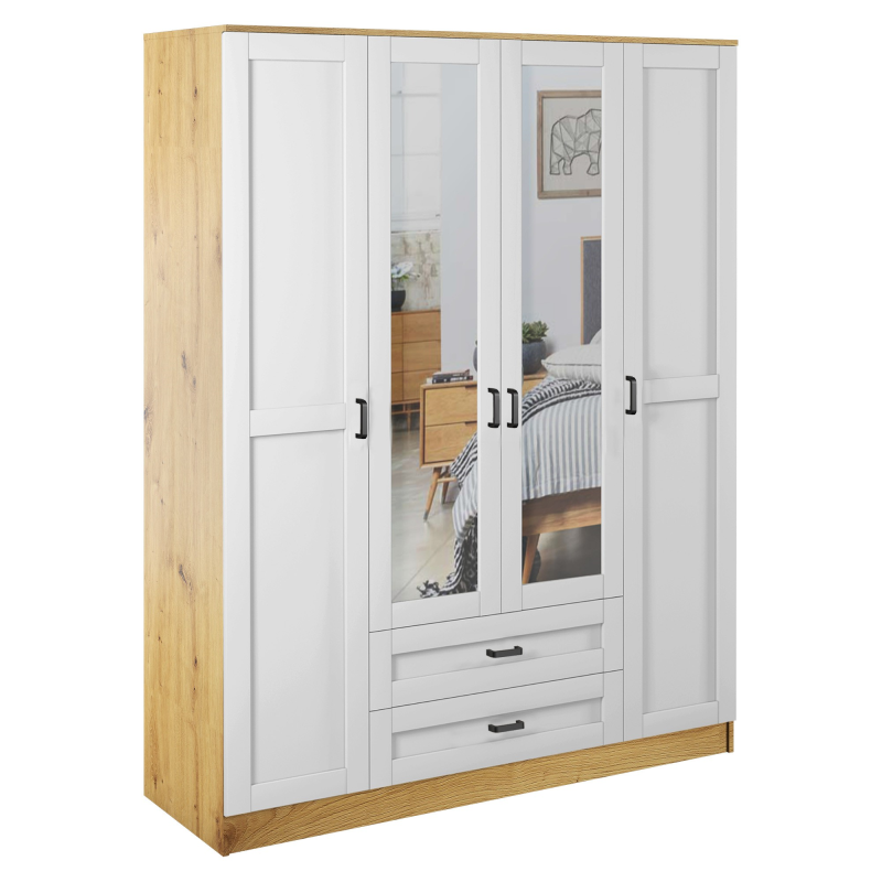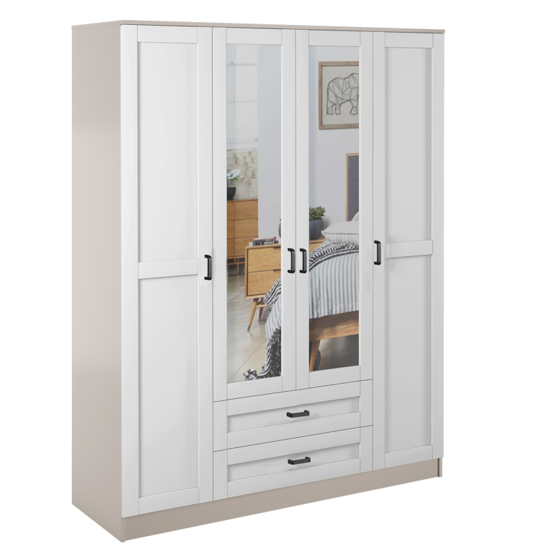 Szafa posiada cztery fronty w ramkowej formie, które nadają jej elegancki i klasyczny charakter. Centralnie umieszczone lustra nie tylko pełnnią praktyczną funkcję, ale również optycznie powiększa przestrzeń i rozjaśnia wnętrze. Wewnątrz znajdziesz liczne półki oraz drążek na ubrania, co zapewnia komfortowe przechowywanie zarówno odzieży wiszącej, jak i złożonych ubrań, dodatków czy pudełek.