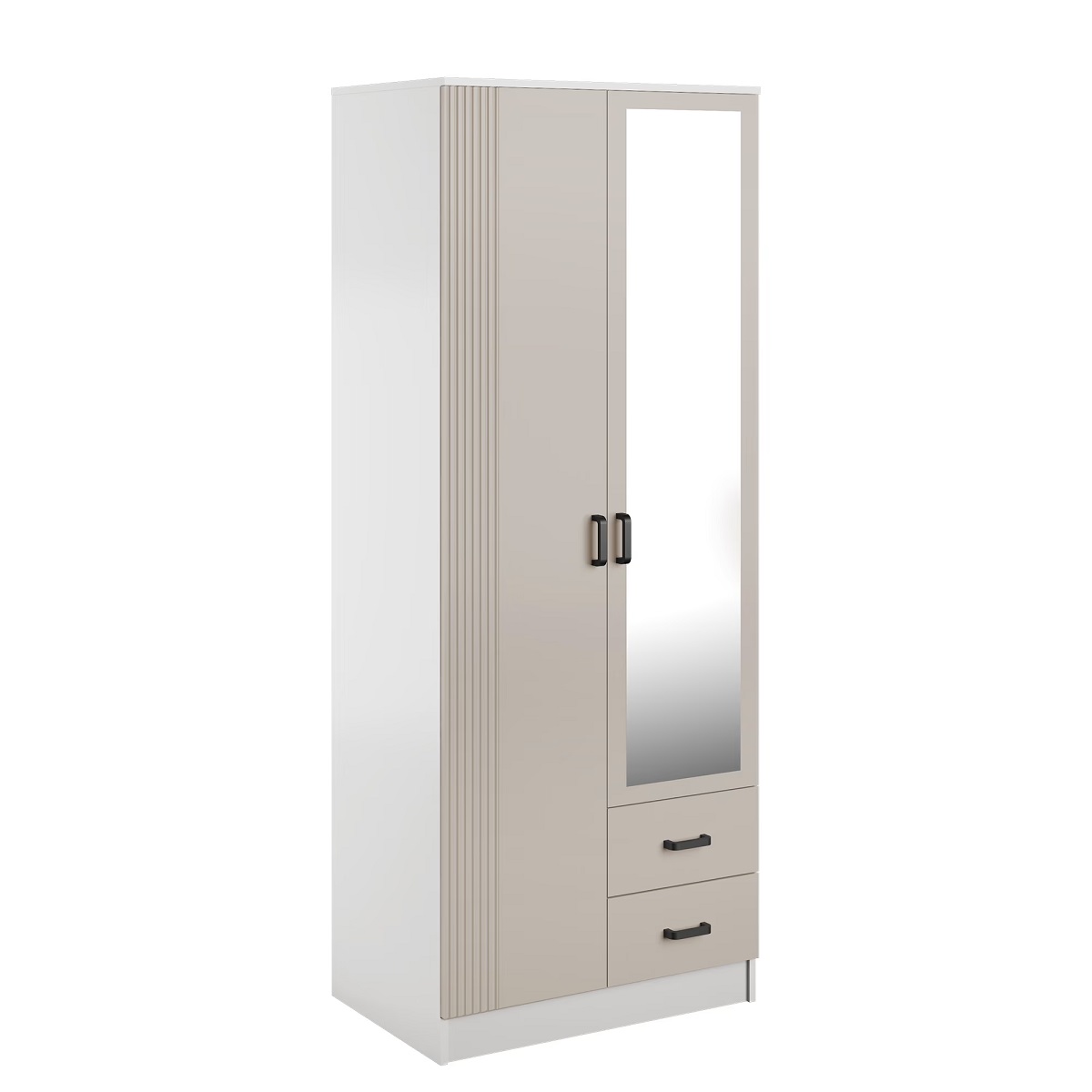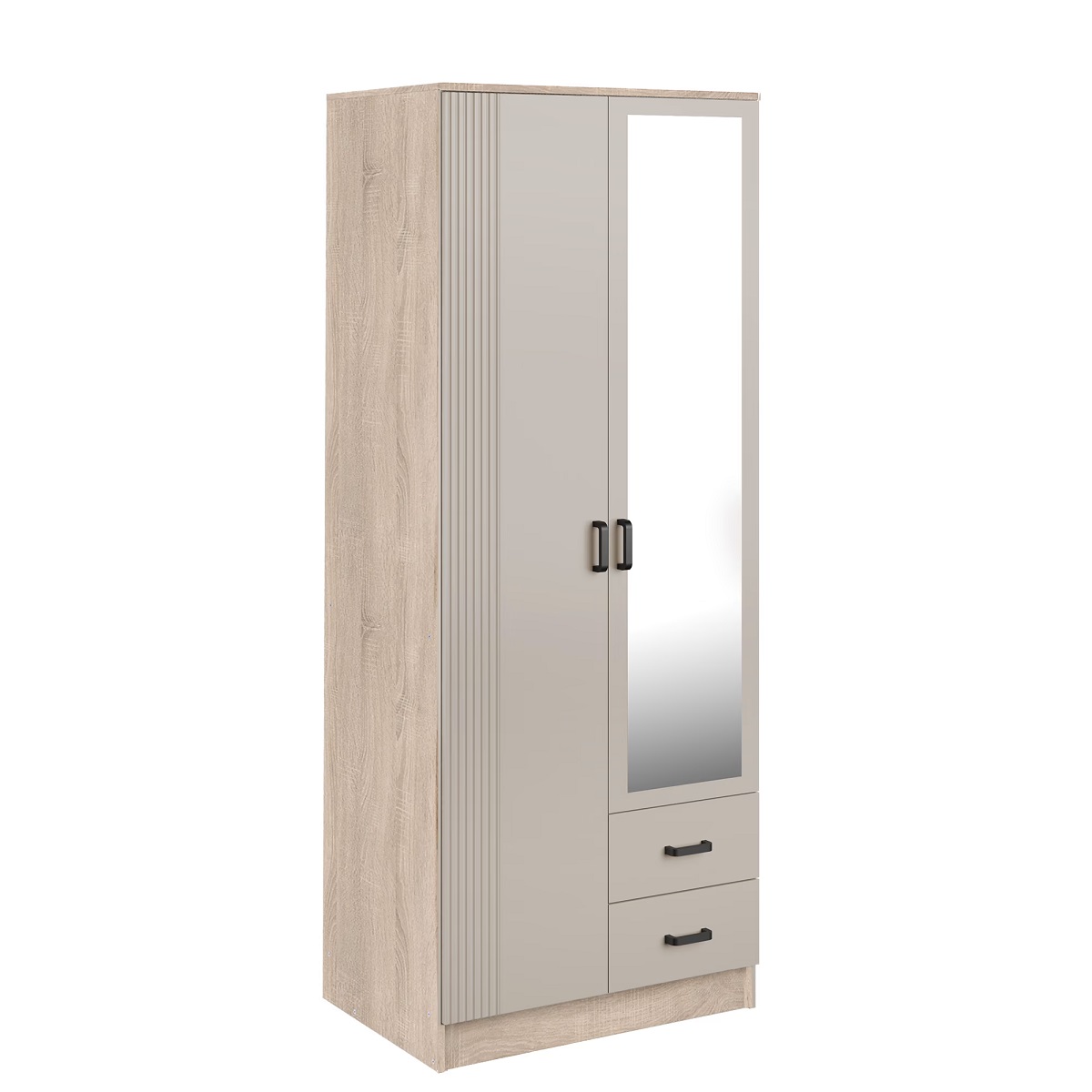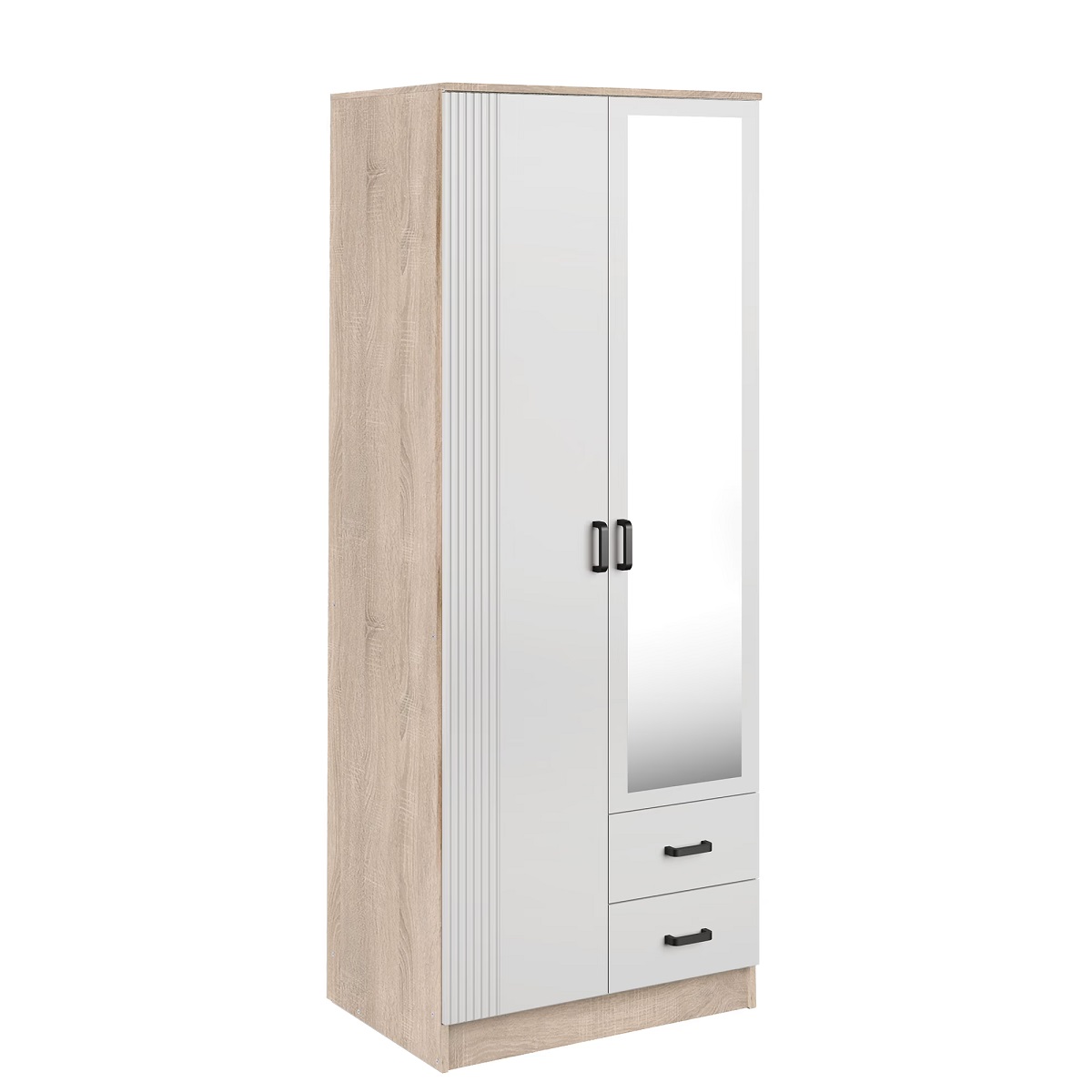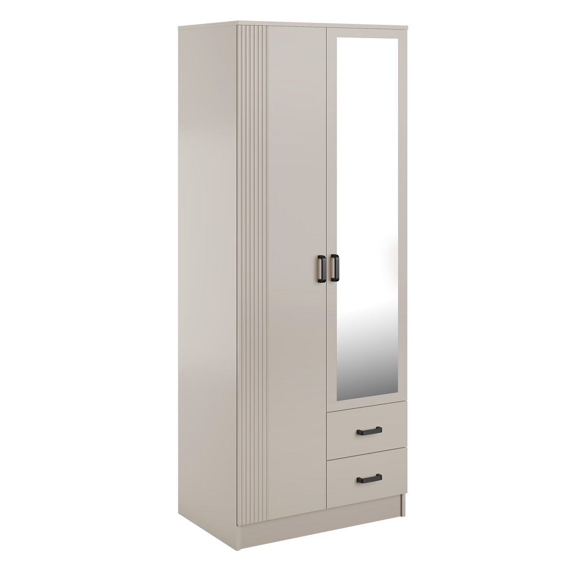 Szafa dwudrzwiowa z eleganckimi, ryflowanymi frontami, lustrem oraz dwiema praktycznymi szufladami.