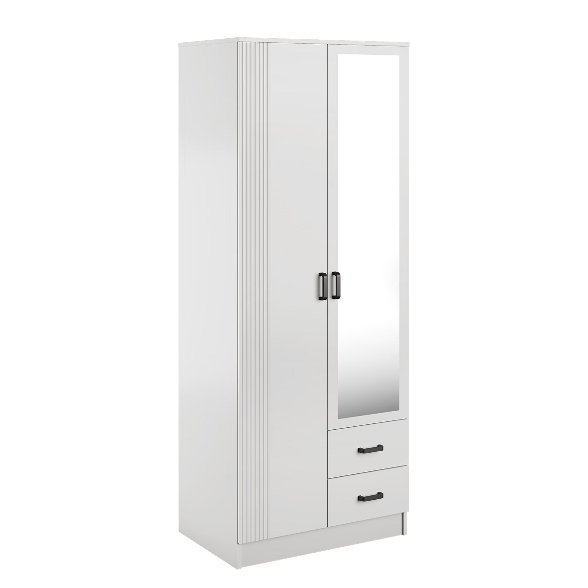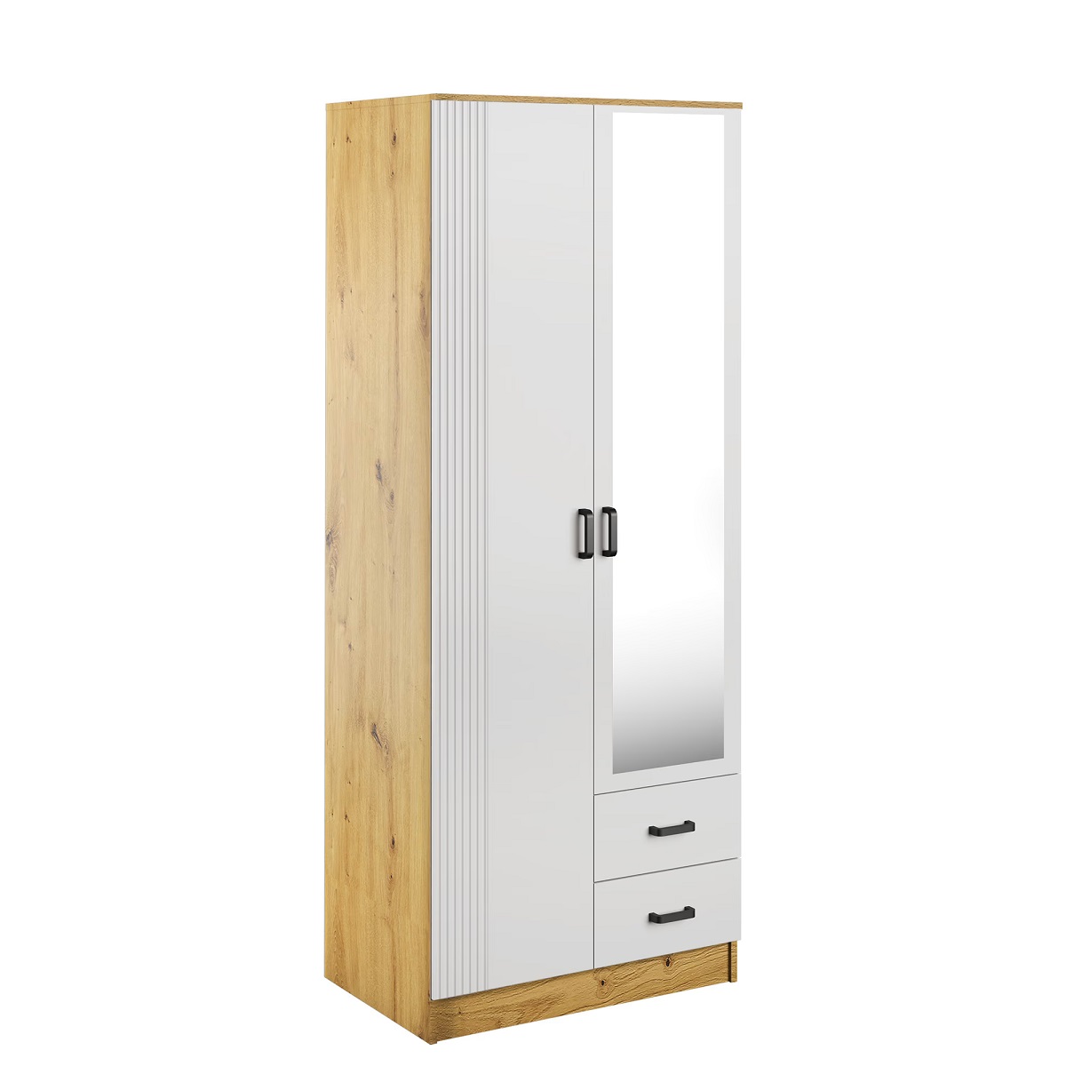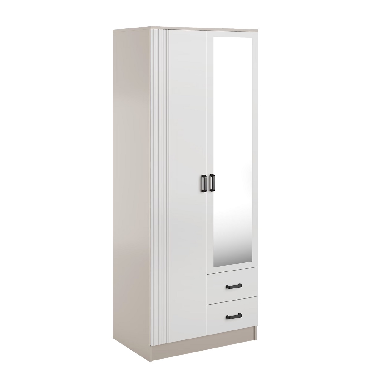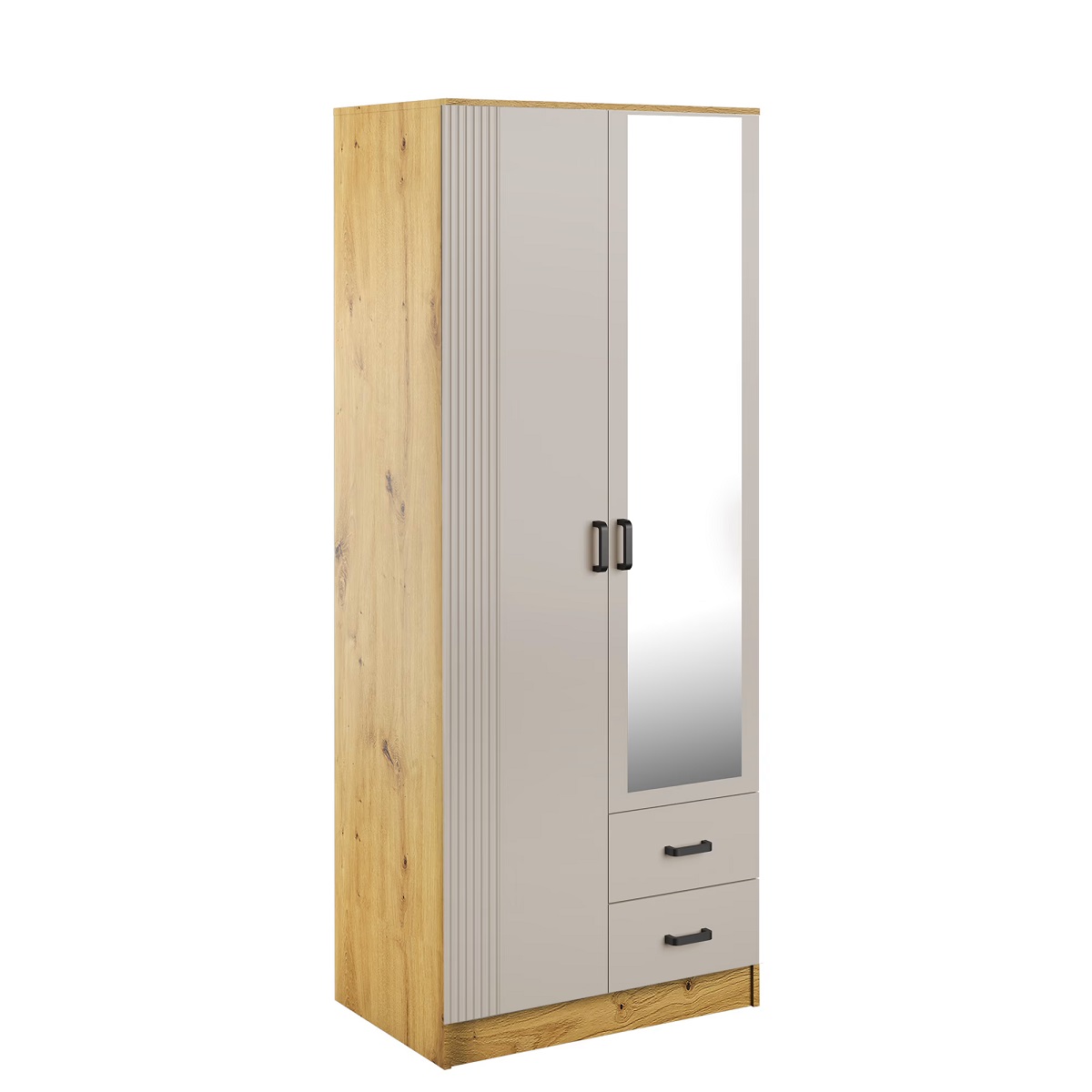 Szafa dwudrzwiowa z eleganckimi, ryflowanymi frontami, lustrem oraz dwiema praktycznymi szufladami.