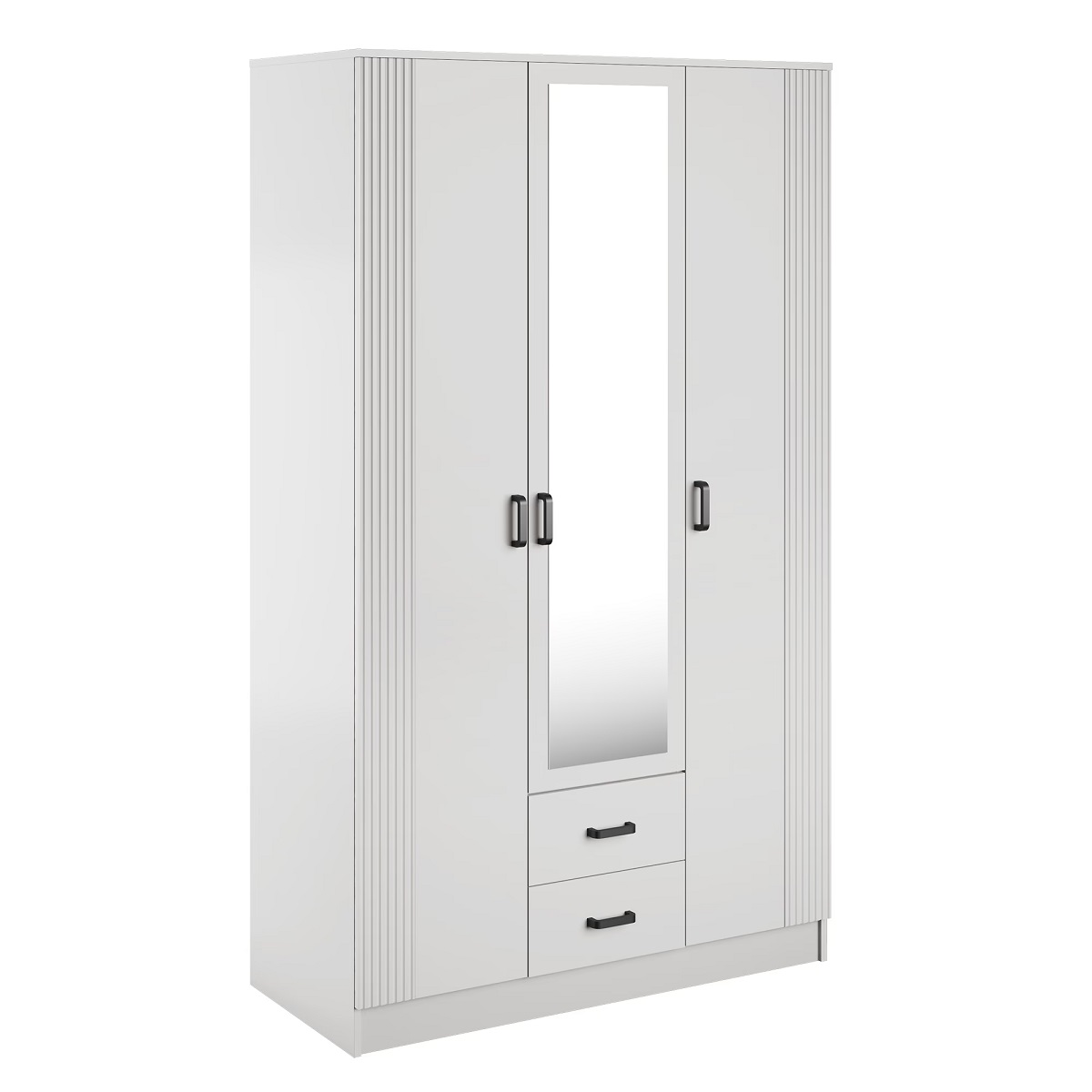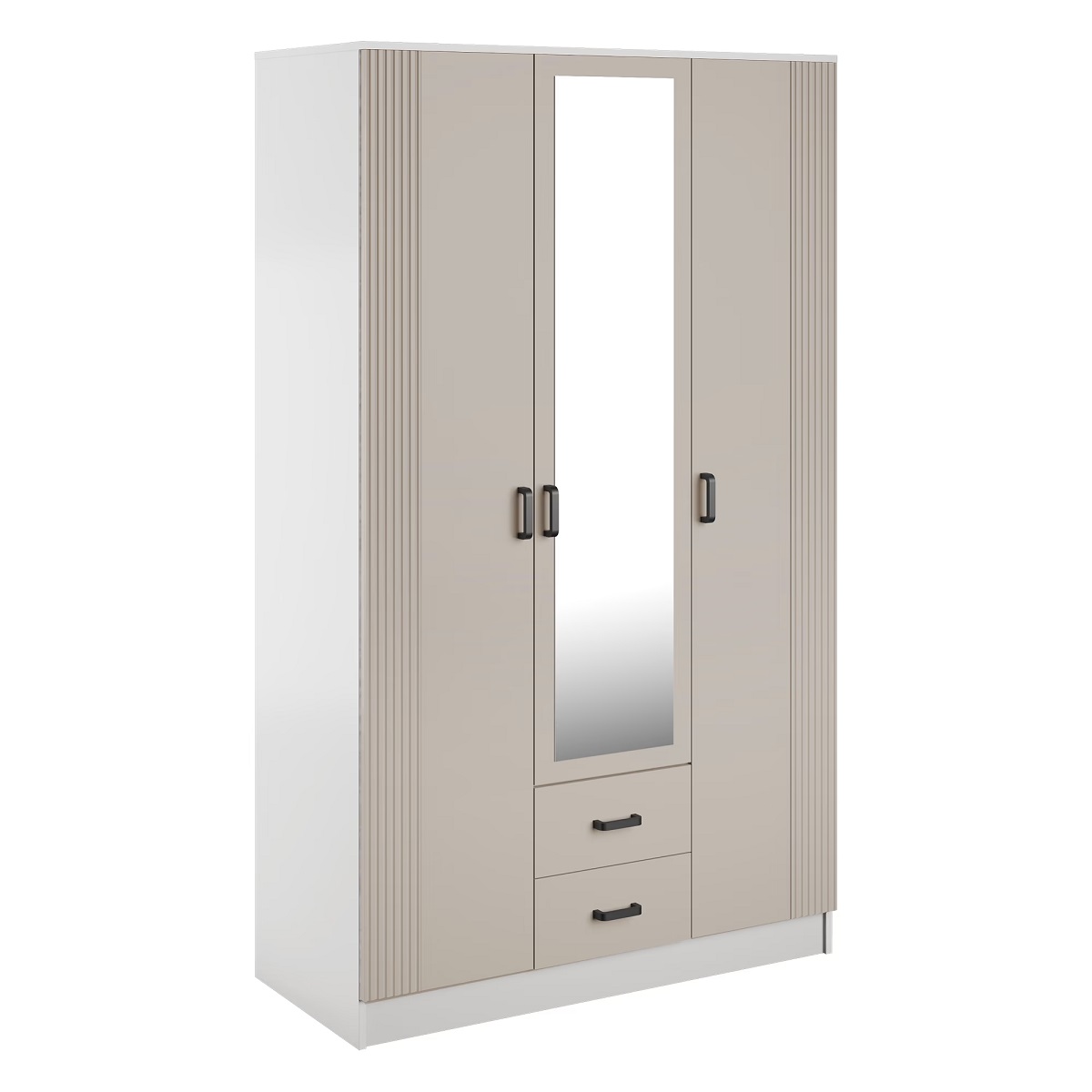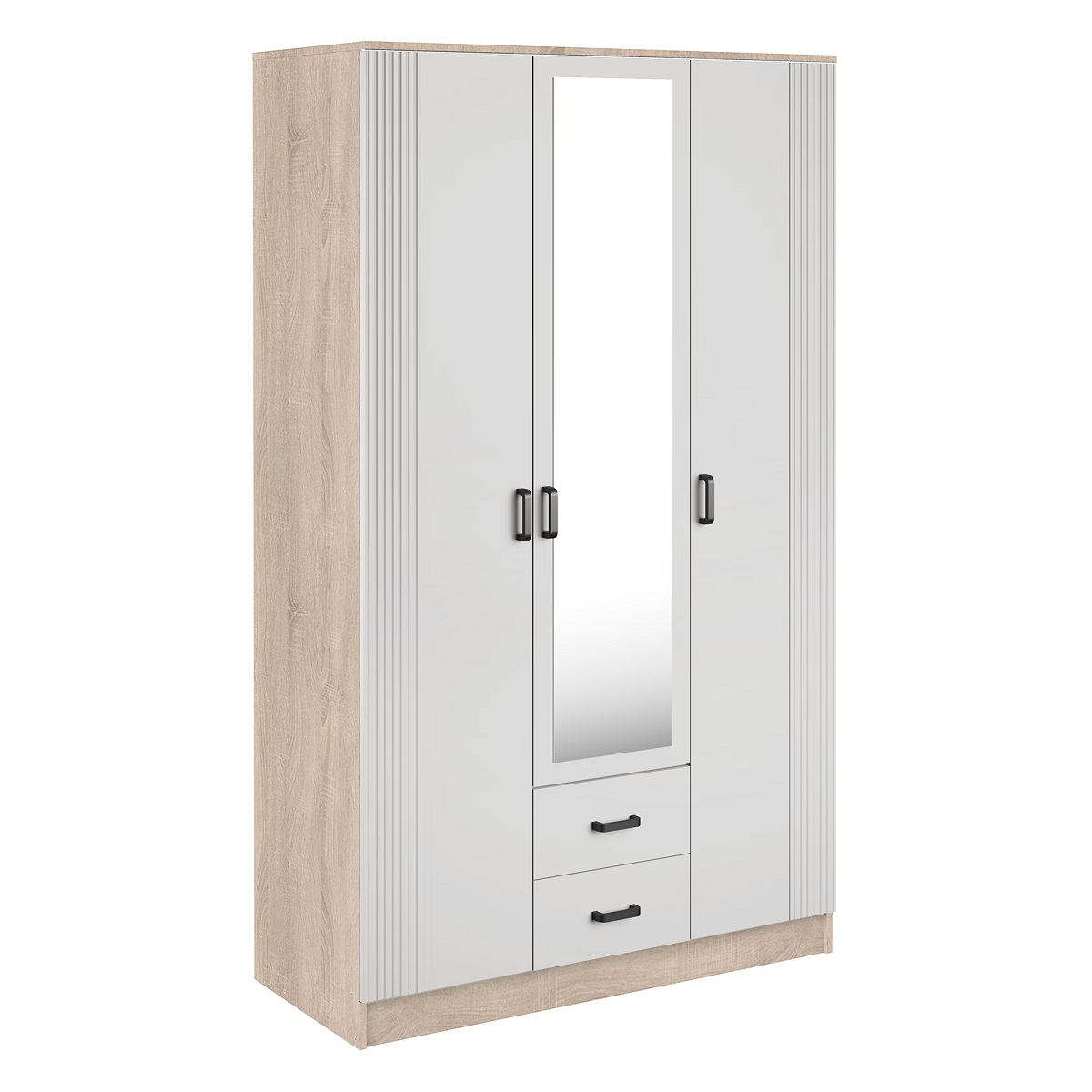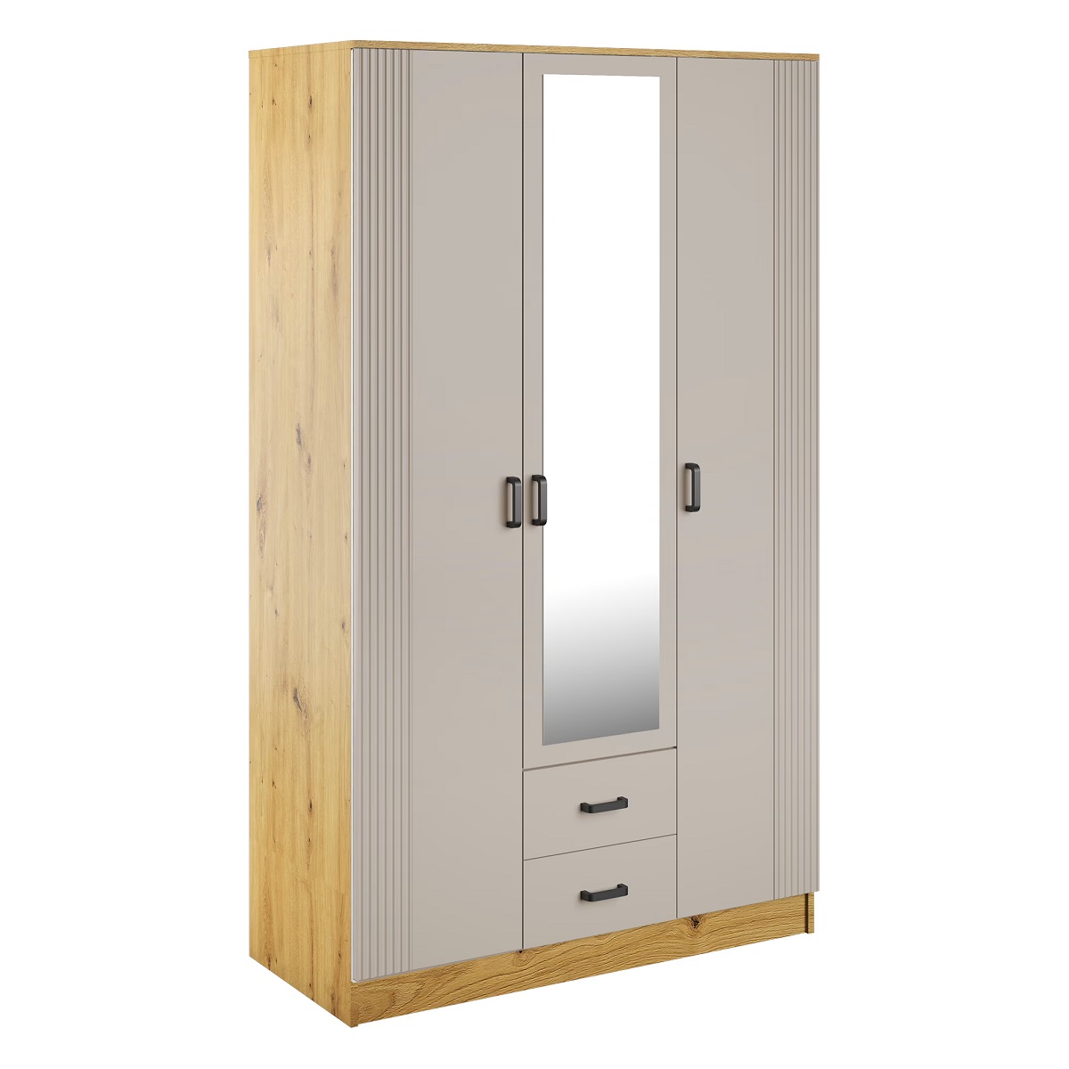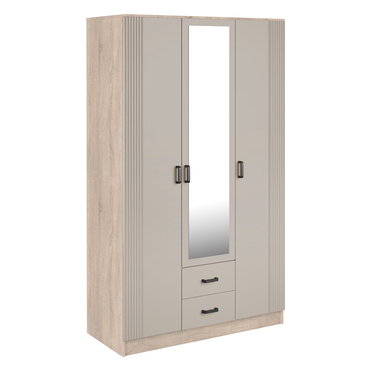 Szafa trzydrzwiowa z eleganckimi, ryflowanymi frontami, lustrem oraz dwiema praktycznymi szufladami.