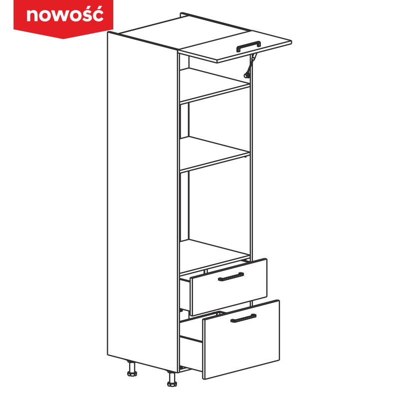 Szafka kuchenna stojąca, wysoka, do zabudowy piekarnika i kuchenki mikrofalowej, z 1 drzwiami uchylnymi. Na dole 2 szuflady. Szerokość 60 cm.