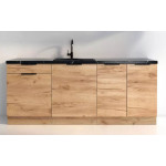 Meble dostępne z frontami w kolorze białym lub dąb kraft złoty. Korpusy białe, w szafkach dolnych uchwyty metalowe, czarne o długości 200 mm.