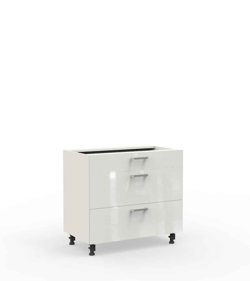 Szafka kuchenna stojąca z 3 szufladami, doskonała do przechowywania sztućców, drobnych akcesoriów kuchennych, garnków i produktów spożywczych, funkcjonalna forma i duża pojemność mebla. Szerokość 90 cm. Szafka sprzedawana bez blatu.