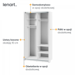 Szafa 120 z lustrem to nie tylko praktyczne mebel do przechowywania, ale również elegancki element wyposażenia wnętrza, który doda świeżości i jasności Twojej przestrzeni. Biała szafa 120 z lustrem to doskonałe rozwiązanie dla tych, którzy pragną harmonii i porządku w swoim otoczeniu. Nasza biała szafa 120 z lustrem nie tylko pomieści całą Twoją garderobę, ale również stanie się efektownym odbiciem Twojej stylizacji. Kolor biały nadaje meblowi lekkości i sprawia, że pomieszczenie staje się jaśniejsze i przestronniejsze. Zaprojektowana z myślą o praktycznym przechowywaniu, szafa z lustrem o szerokości 120 cm posiada idealnie rozmieszczone półki oraz drążki, co umożliwia efektywne zorganizowanie przestrzeni. Teraz utrzymanie porządku w garderobie stanie się łatwe i przyjemne. Solidna konstrukcja oraz wysokiej jakości materiały, z których wykonana jest nasza szafa, gwarantują trwałość i długotrwałą satysfakcję z użytkowania. Biała kolorystyka sprawia, że szafa z łatwością dopasuje się do różnych stylów aranżacyjnych, tworząc spójną i elegancką całość. Zainwestuj w komfort i funkcjonalność z naszą białą szafą z lustrem o szerokości 120 cm. Dodatkowo szafę możesz doposażyć o samodomykacz do drzwi przesuwnych, kontenerek, półki dzięki którym z łatwością dostosujesz wnętrze szafy do swoich potrzeb, a także w opaskę z oświetleniem, która z zależności od wolnego miejsca do zagospodarowania pozwoli Ci dopasować szerokość szafy.