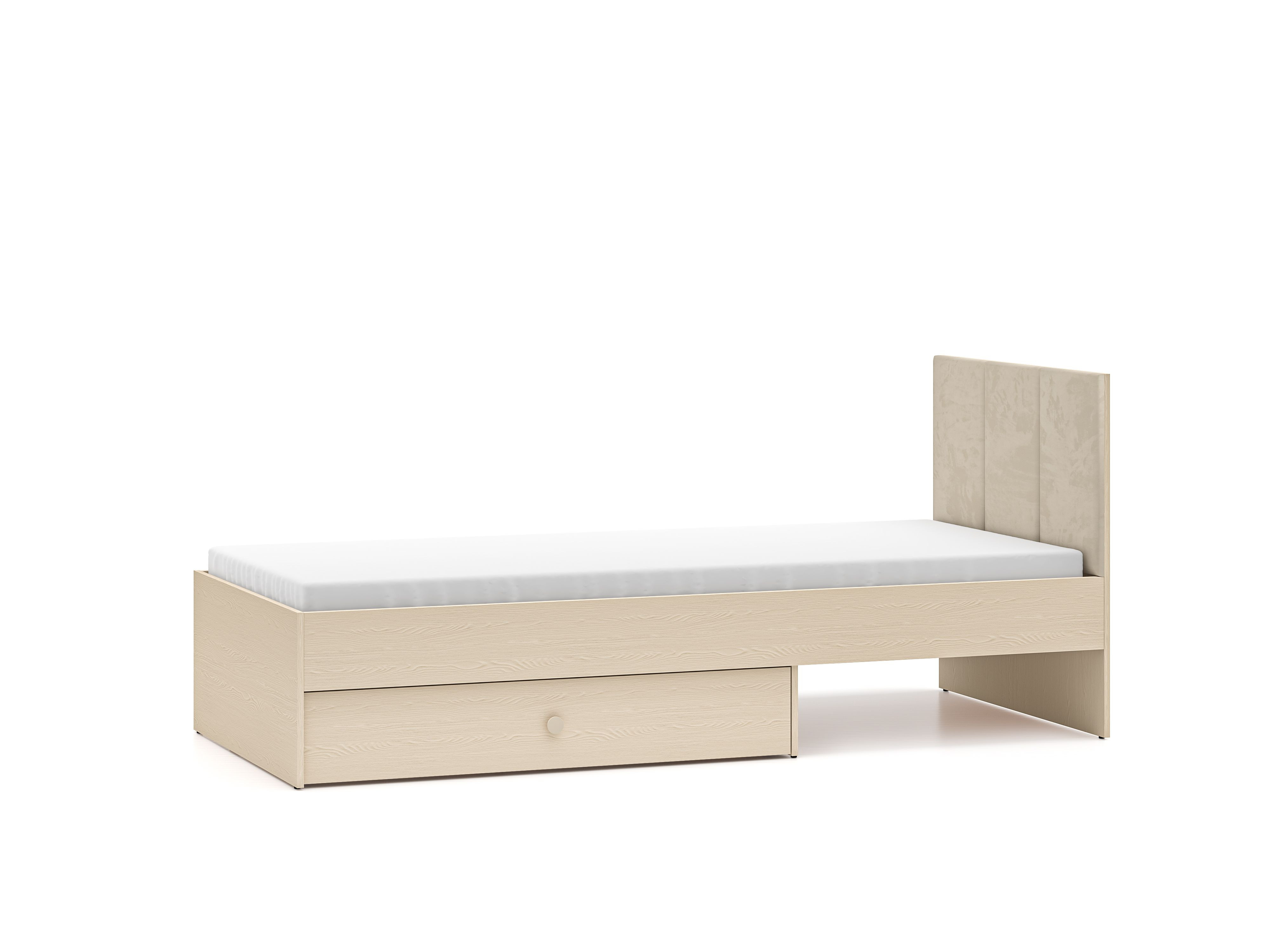 - Prosty układ: Zagłówek łóżka wykonany z beżowego weluru, w cenę łóżka wliczony stelaż. W cenę nie jest wliczony materac.
