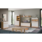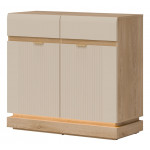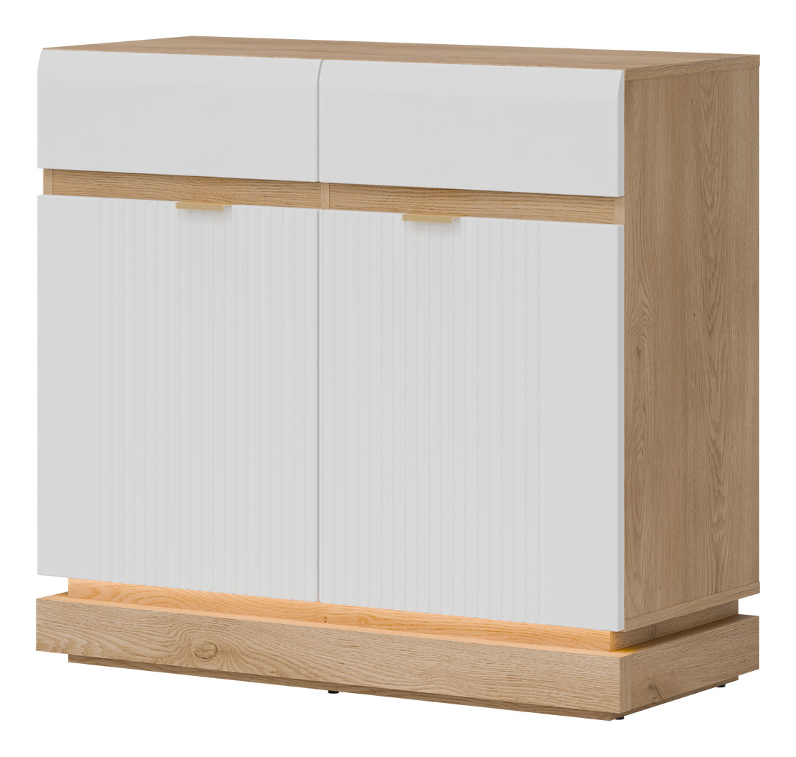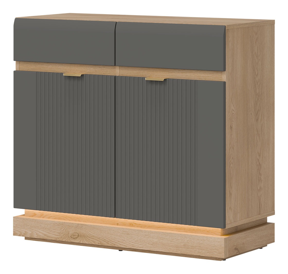 Nowoczesna komoda ML02 z kolekcji MILTON to propozycja dla osób ceniących przemyślane rozwiązania i wyrafinowany styl. Fronty MDF w matowym wykończeniu, dostępne w kilku eleganckich wariantach kolorystycznych, zostały ozdobione subtelnym, pionowym frezowaniem, które przyciąga wzrok i podkreśla nowoczesny charakter mebla. Złote uchwyty dodają całości szyku i elegancji. Wnętrze komody skrywa praktyczne półki oraz szuflady na prowadnicach kulkowych, które – dzięki systemowi cichego domyku – zapewniają wygodę użytkowania i bezgłośne działanie. To idealne miejsce do przechowywania zastawy stołowej, tekstyliów czy domowych drobiazgów. Korpus w dekorze dąb cremona torro dodaje naturalnego ciepła, tworząc przytulną, a jednocześnie nowoczesną kompozycję. Opcjonalne oświetlenie LED w dolnej części mebla buduje przyjemny klimat i podkreśla jego lekką, stylową formę. Komoda MILTON znakomicie sprawdzi się w salonie, jadalni, przedpokoju, a nawet w nowoczesnym gabinecie – łącząc funkcjonalność, komfort i estetykę na najwyższym poziomie. Wnętrze mebla kryje praktyczne półki oraz szuflady na prowadnicach kulkowych, które – wraz z systemem cichego domyku – zapewniają wysoki komfort użytkowania i bezgłośną pracę.