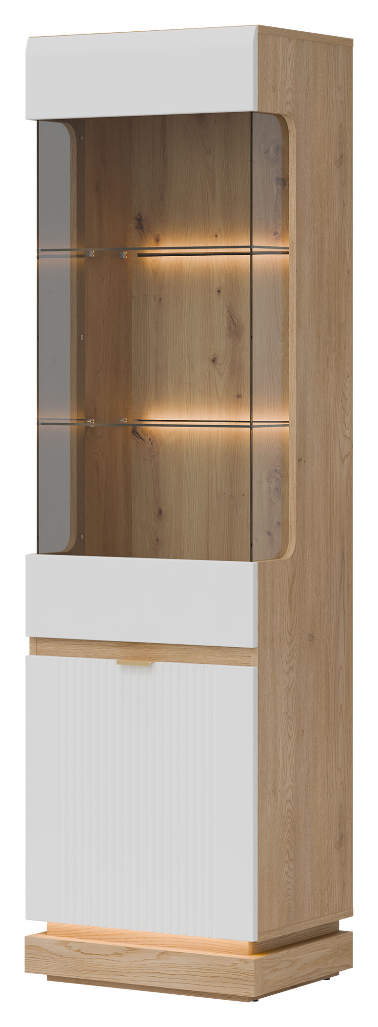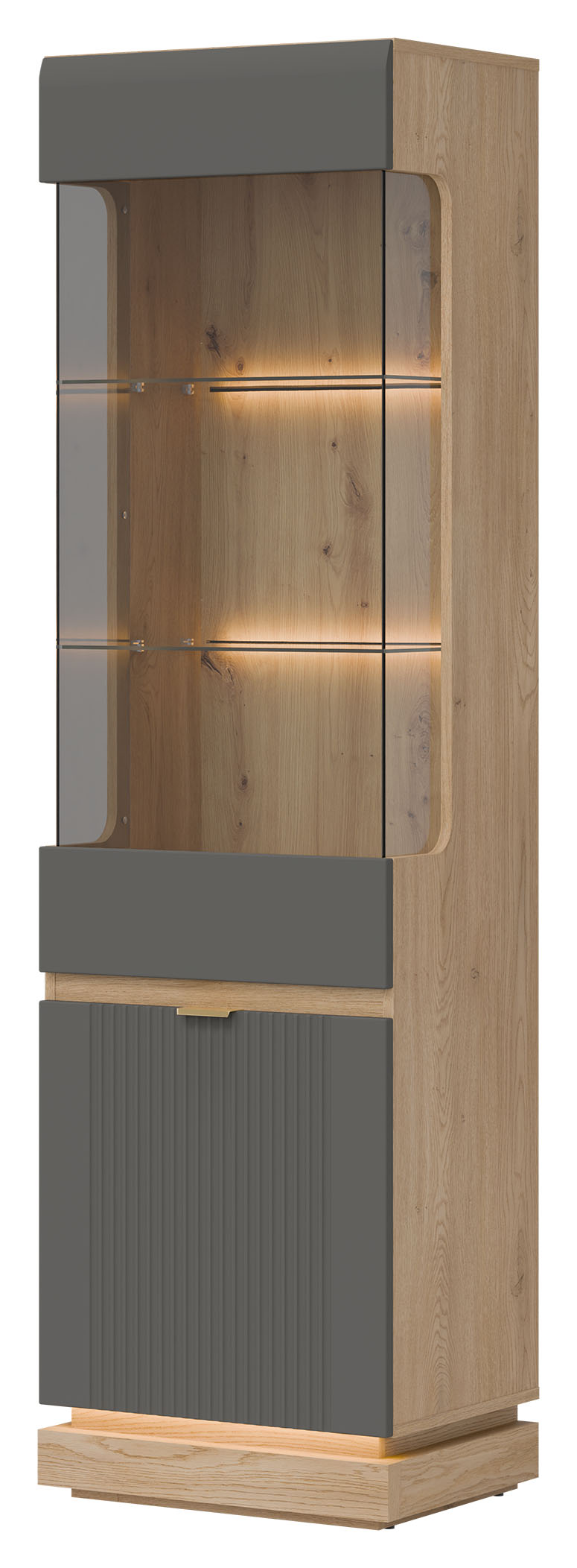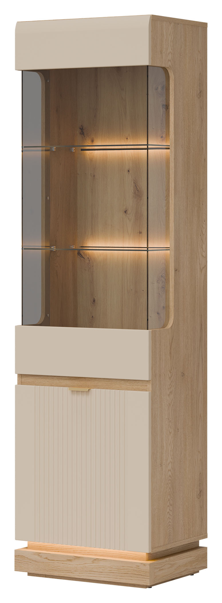 Witryna ML05 z kolekcji MILTON to wyższa wersja modelu ML04, oferująca jeszcze więcej elegancji i funkcjonalności. Fronty MDF w matowym wykończeniu, dostępne w kilku modnych kolorach, zostały wzbogacone o subtelne, pionowe frezowanie w dolnej części, które nadaje meblowi nowoczesnego, a zarazem wyrafinowanego charakteru. Minimalistyczne, złote uchwyty dodają elegancji, a opcjonalne oświetlenie LED w części ekspozycyjnej wprowadza przyjemny, nastrojowy klimat. Górna, przeszklona część witryny umożliwia efektowne wyeksponowanie dekoracji, szkła lub pamiątek, natomiast zamykane szafki w dolnej części oferują przestronną i praktyczną strefę przechowywania. Korpus w dekorze dąb cremona torro wprowadza ciepły, naturalny akcent i doskonale komponuje się z każdą wersją kolorystyczną frontów, tworząc harmonijną i estetyczną całość. Witryna wyposażona została w system cichego domyku, który zapewnia wysoki komfort użytkowania. To idealny mebel do salonu, jadalni lub kuchni, który łączy styl, funkcjonalność i ponadczasową klasę.