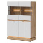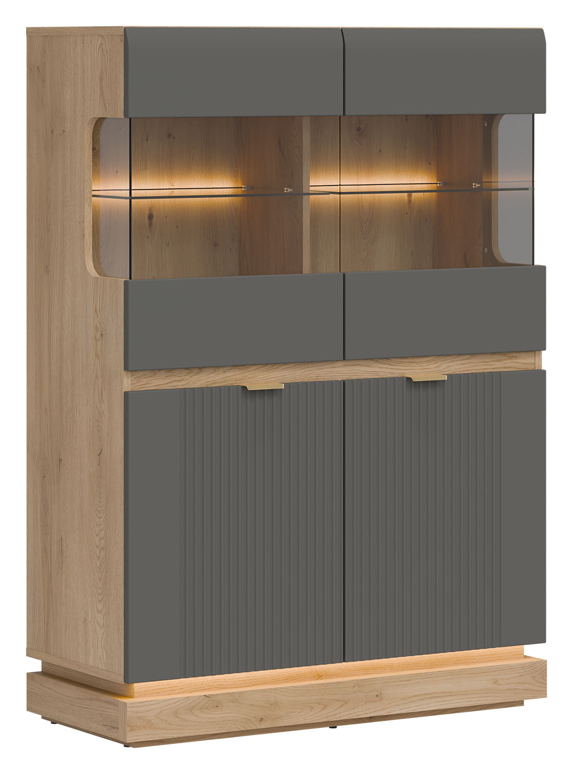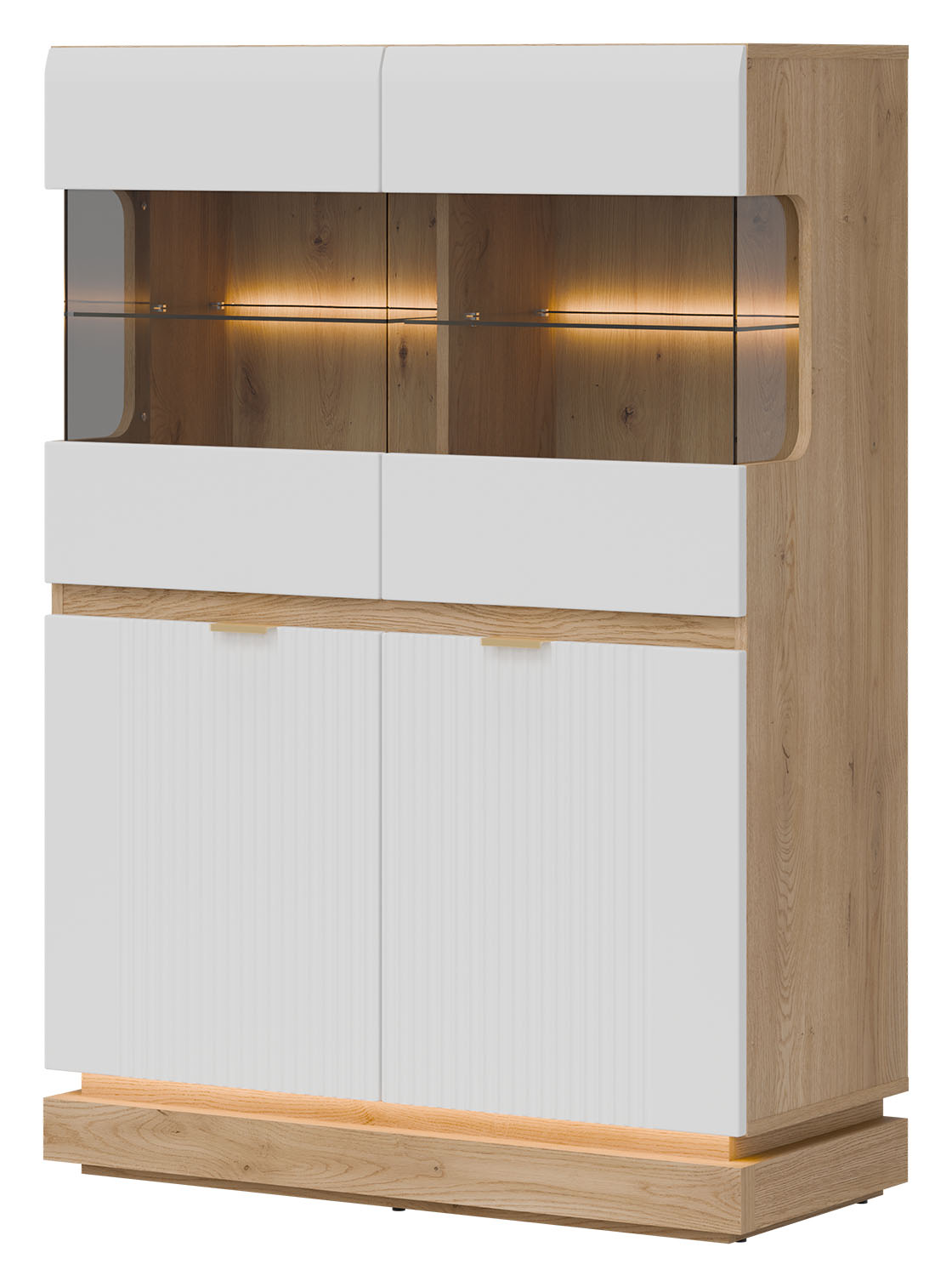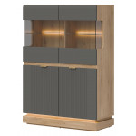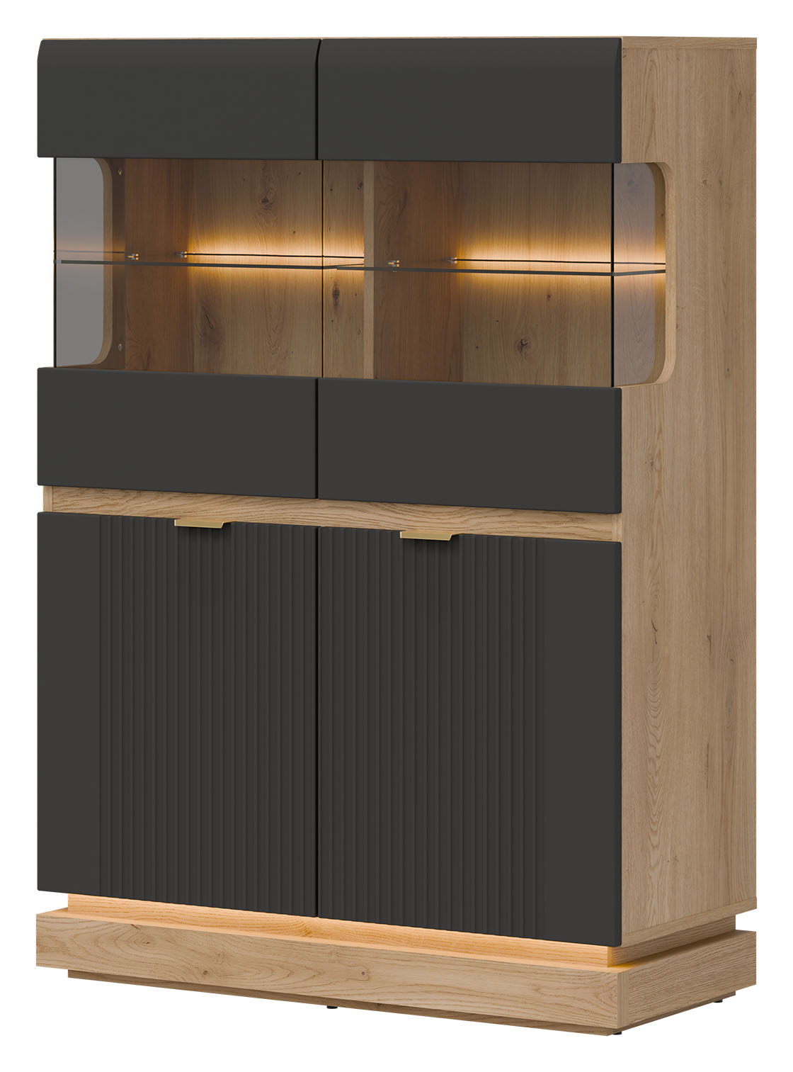 Witryna ML04 z kolekcji MILTON to doskonałe połączenie estetyki i funkcjonalności, zaprojektowane z myślą o nowoczesnych aranżacjach. Matowe fronty MDF dostępne w kilku eleganckich kolorach zostały ozdobione subtelnym, pionowym frezowaniem w dolnej części, które przyciąga uwagę i nadaje meblowi niepowtarzalnego charakteru. Złote uchwyty w minimalistycznej formie podkreślają wyrafinowany styl, a opcjonalne oświetlenie LED w części ekspozycyjnej wprowadza nastrojowy klimat. Przeszklona górna część witryny doskonale nadaje się do eksponowania zastawy, szkła czy dekoracyjnych dodatków, natomiast zamykane szafki w dolnej części oferują funkcjonalną przestrzeń do przechowywania. Korpus w dekorze dąb cremona torro ociepla całość kompozycji i znakomicie komponuje się z różnorodną kolorystyką frontów, tworząc spójną i harmonijną całość. Witryna została wyposażona w system cichego domyku, który zapewnia komfort użytkowania na co dzień. Idealnie sprawdzi się w salonie, jadalni lub przestronnej kuchni, dodając wnętrzu stylu, elegancji i praktyczności.