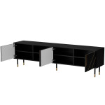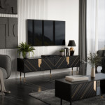 Szafka RTV Mountain 200 cm to połączenie nowoczesnego designu i funkcjonalności. Matowe czarne fronty MDF ozdobione złotymi lakierowanymi elementami nadają jej luksusowy charakter. Brak uchwytów i system Push to Open zapewniają minimalistyczny wygląd oraz wygodę użytkowania. Stabilne metalowe nóżki (18 cm) w czarno-złotym wykończeniu dodają lekkości i elegancji. Idealna do nowoczesnych wnętrz, stanowi stylowy element każdej aranżacji.