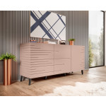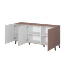 Opis i parametry Komoda NOVA to idealny mebel, nadający naszemu pomieszczeniu smaku. Jej perfekcyjne wykończenie na frontach wyróżnia się na tle innych mebli. Komoda z pewnością znajdzie swoje miejsce w salonie, jak i sypialni. Wykonanie: korpus: płyta MDF 16 mm matowa fronty: płyta MDF 18 mm z widocznymi frezami uchwyty: brak, fronty przestają ponad blat nóżki: tworzywo sztuczne w kolorze czarnym, 12 cm Opis produktu: trzy fronty otwierane do boków wewnątrz po jednej półce