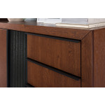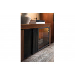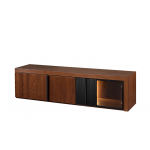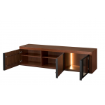 Nowoczesna i funkcjonalna szafka RTV, która dzięki czterem drzwiom zapewnia dużo miejsca na sprzęt multimedialny i akcesoria. Jej minimalistyczny design oraz połączenie ciepłego drewna z czarnymi akcentami wpisuje się w najnowsze trendy wnętrzarskie.