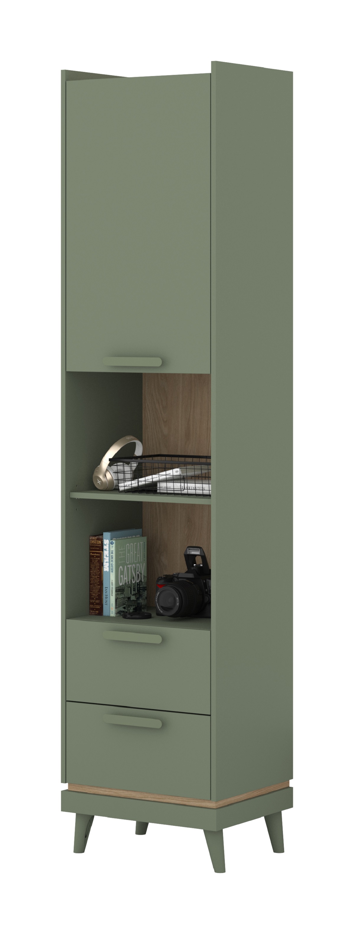 Regał został zaprojektowany z myślą o praktycznym przechowywaniu – posiada zamykaną szafkę, dwie pojemne szuflady oraz otwarte półki idealne na książki, dekoracje lub sprzęt fotograficzny.
