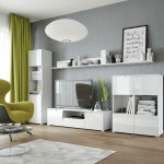 Witryna niska z podwójnymi drzwiami z kolekcji mebli systemowych " SELENE" to połączenie funkcjonalności z oryginalnym designem i lekkością jaką nadają fronty w białym wysokim połysku.