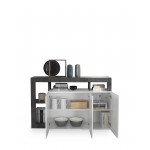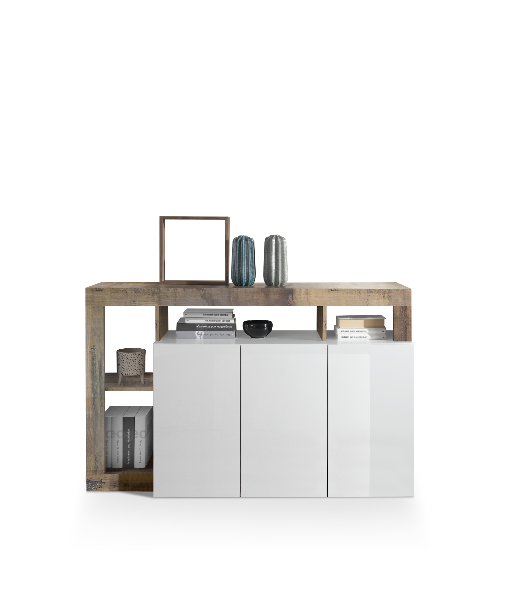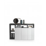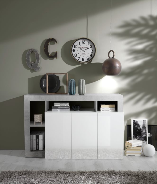 Komoda trzydrzwiowa Hamburg dostępna w różnuch wersjach kolorystycznych: biały połysk w połączeniu z szarym kolorem bądź odcieniem drewna.