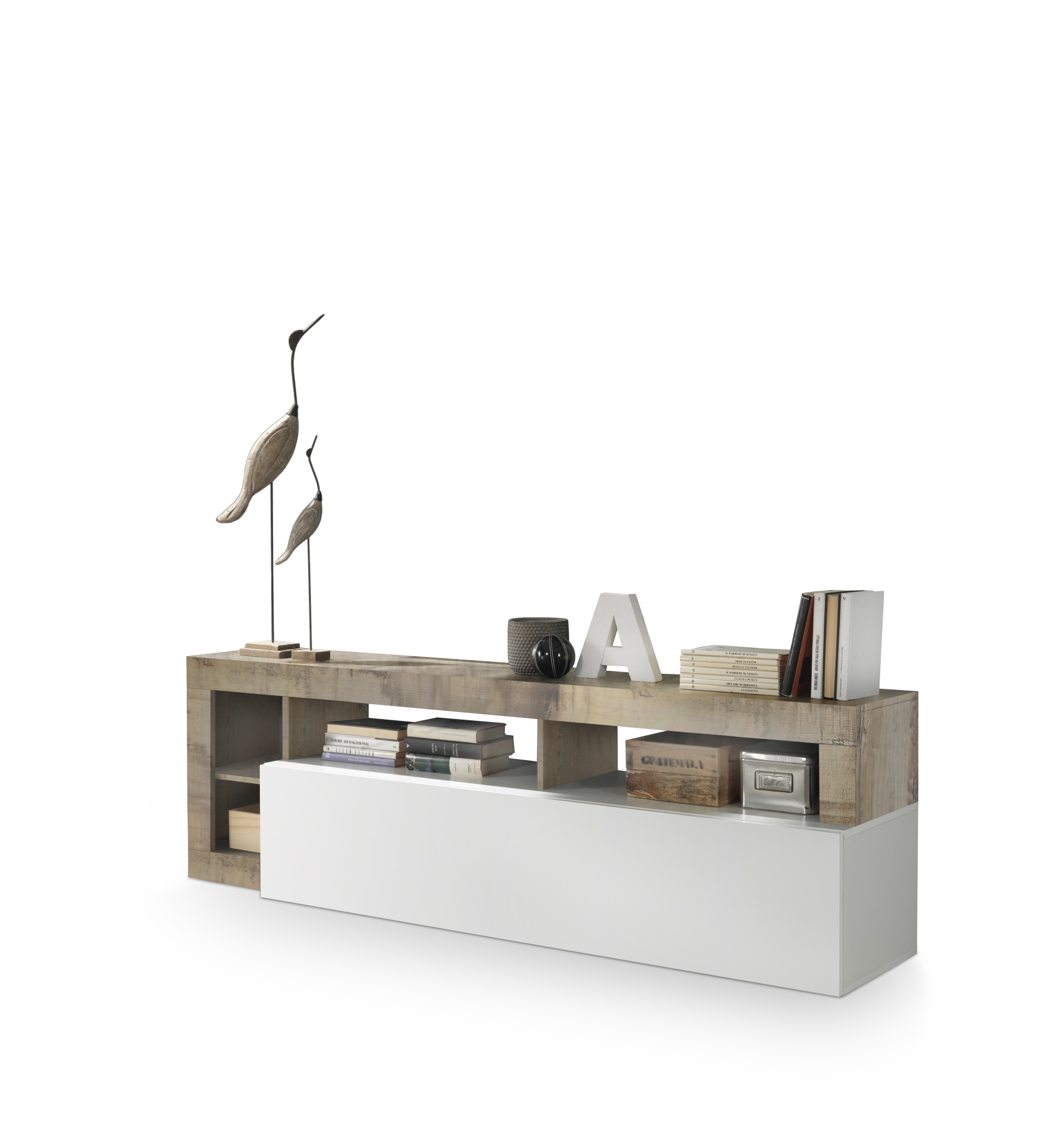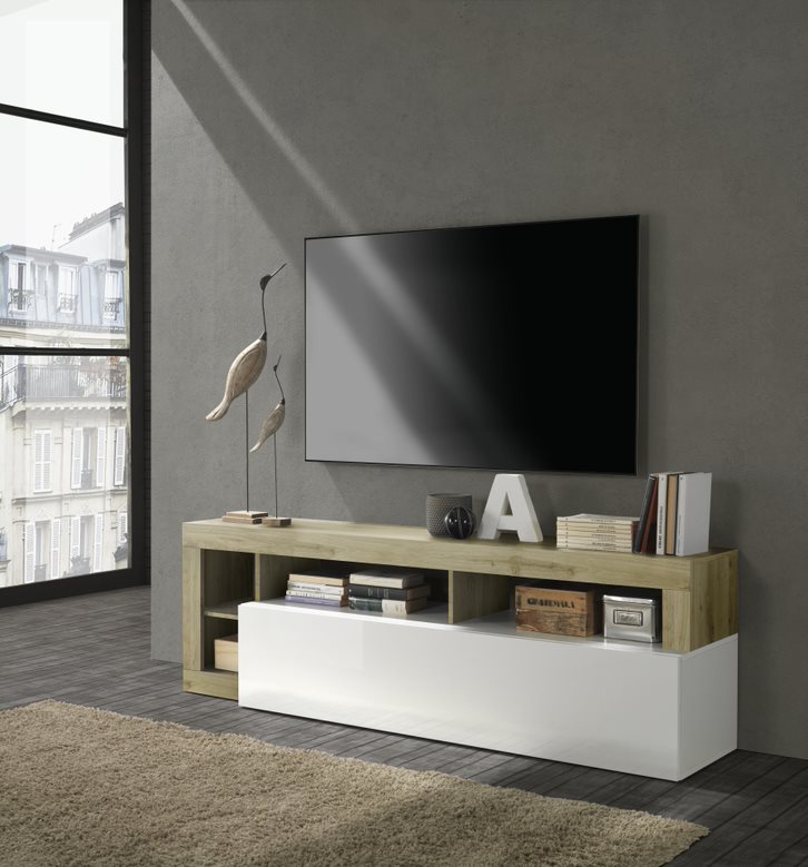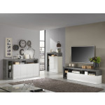 Szafka RTV Hamburg to nowoczesna propozycja do salonu. Wykonana została z wysokiej jakości płyty meblowej. Występuje w dwóch odcieniach: biały połysk w połączeniu z szarym kolorem bądź odcieniem drewna. Szafka rtv Hamburg to stylowa i praktyczna szafka do salonu.