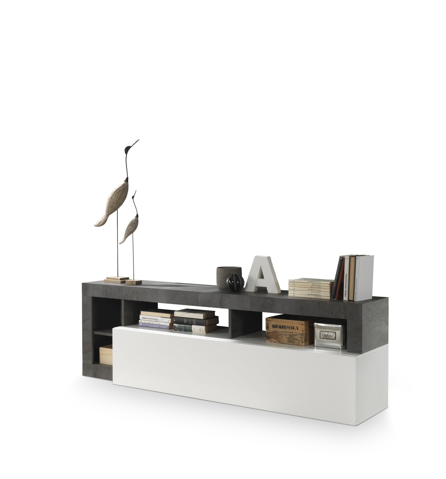 - front: lakier biały połysk, korpus: laminat biały mat / laminat beton