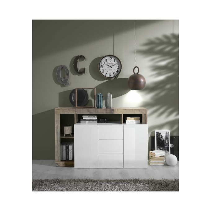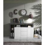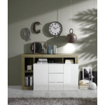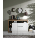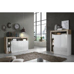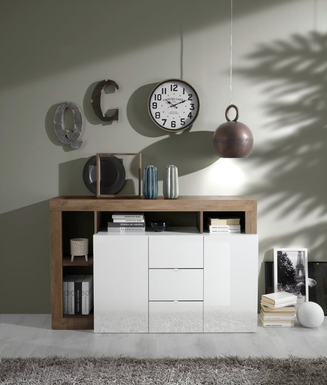 Komoda dwudrzwiowa z trzema szufladami Hamburg dostępna w różnuch wersjach kolorystycznych: biały połysk w połączeniu z szarym kolorem bądź odcieniem drewna.