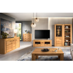 Witryna Velvet to mebel będący połączeniem nowoczesnego myślenia o designu i klasycznych rozwiązań. Masywna bryła zestawiona z delikatną kolorystyką sprawia, że projekty z tej linii pozwolą stworzyć elegancko skomponowane wnętrze. Charakterystyczna, podświetlana wstawka ze szropowanego drewna litego umieszczona została pomiędzy elementami frontów. Spójna kompozycja przejścia tworzy wrażenie, że bryła witryny jest lżejsza. Przeszklona przestrzeń to doskonałe miejsce na wyeksponowanie ulubionych ozdób i dekoracji. Półki ukryte za pełnymi drzwiami będą doskonałym schowkiem na przydatne przedmioty i akcesoria. Witryna z kolekcji Velvet to propozycja dla osób szukających niebanalnych rozwiązań.